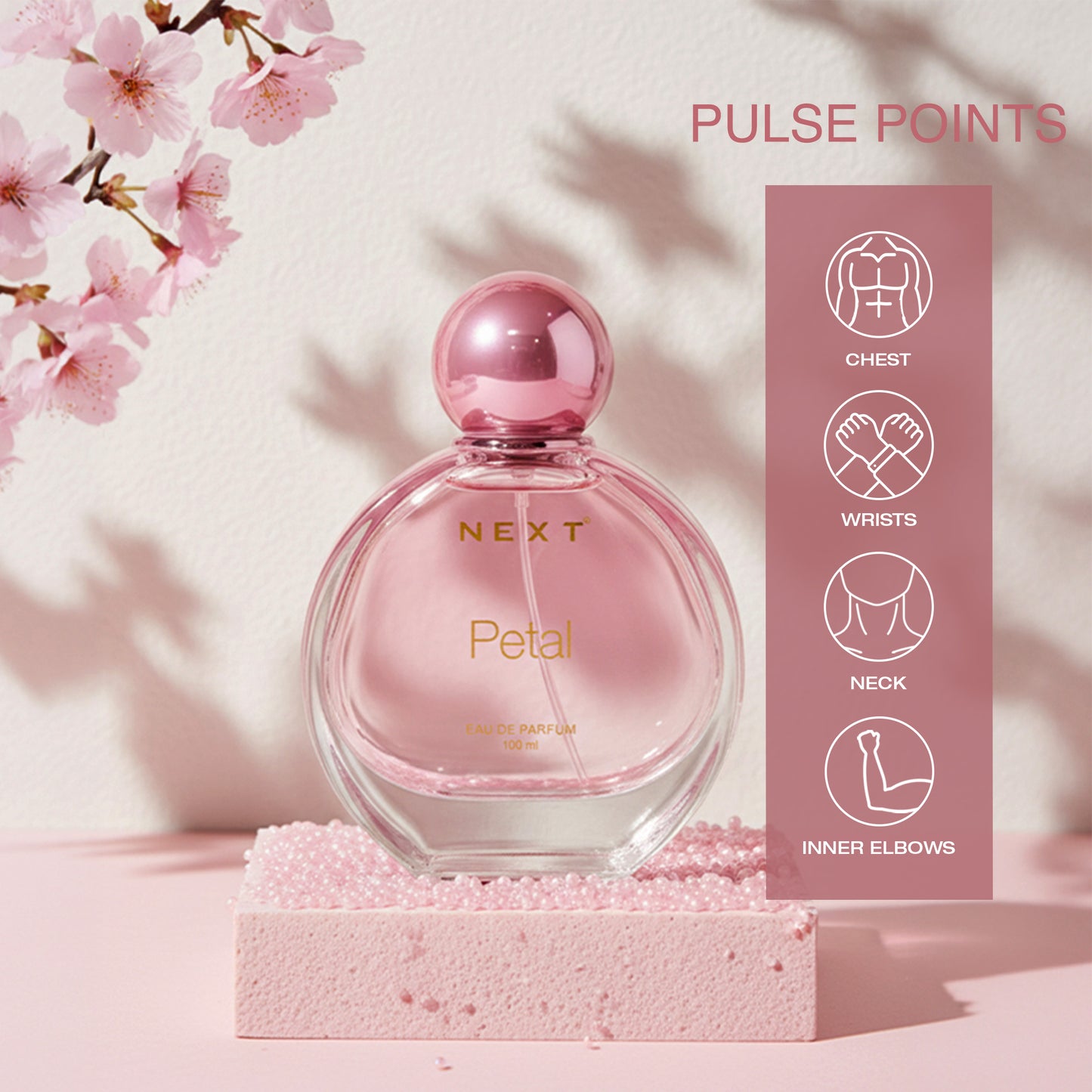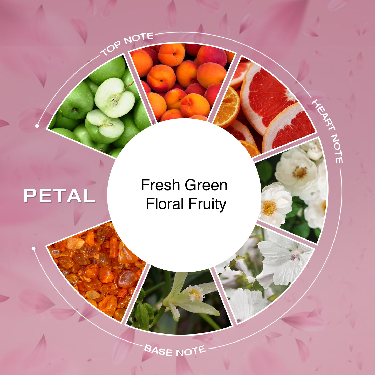 Petal celebrates femininity with a scent that feels fresh, graceful, and uplifting. It begins with a vibrant burst of fresh green notes, crisp green apple, and sparkling citrus that instantly energizes the senses. The heart blooms with elegant jasmine and gardenia blended with a delicate touch of fruity peach, creating a soft yet captivating floral character. As the fragrance settles, warm white musk, amber, and vanilla leave behind a smooth and comforting trail. A fragrance that reflects confidence, softness, and the beauty of being effortlessly you.