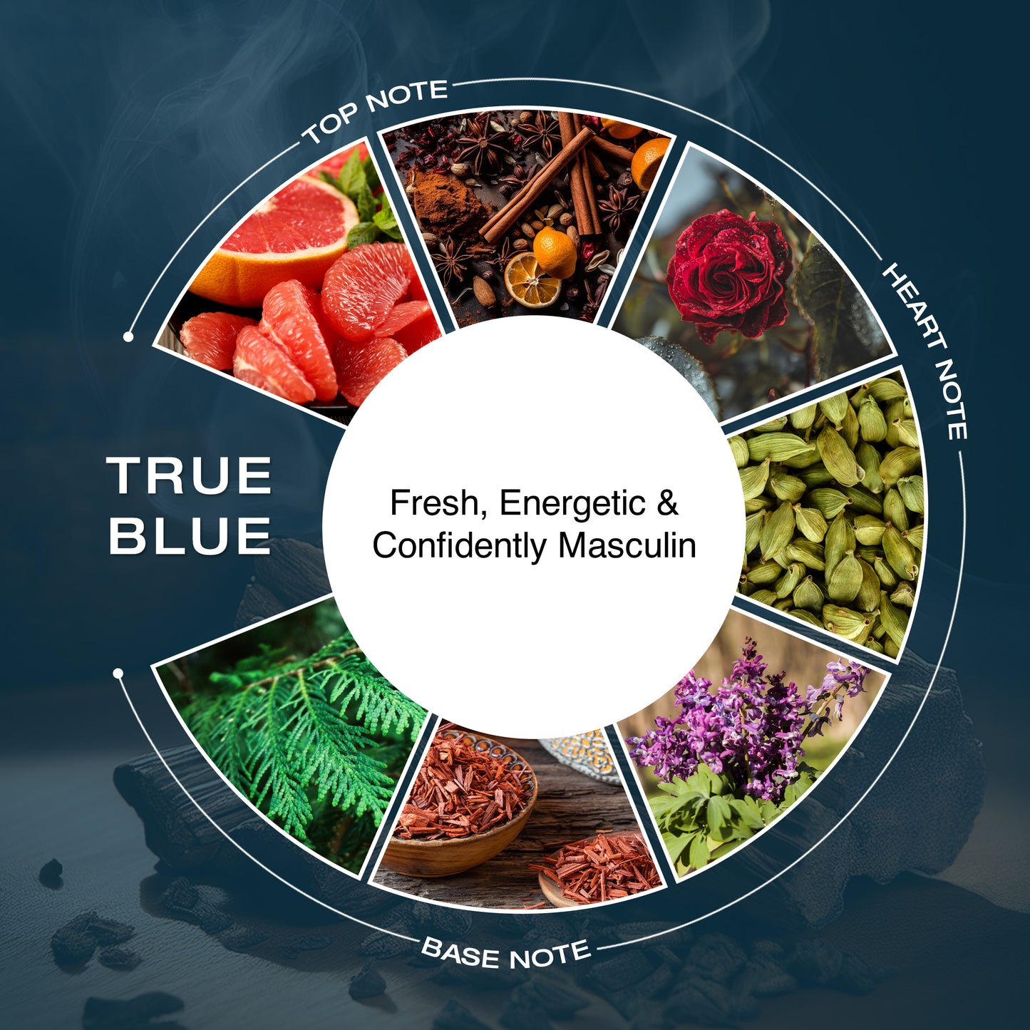 True Blue Perfume brings a crisp, energetic, and refreshing scent crafted for men who like to keep it clean, bold and timeless. It opens with a bright burst of grapefruit, mandarin and lemon, paired with an aromatic lift that instantly refreshes your senses. As the fragrance develops, jasmine, rose, anise, and cardamom add a warm, spicy floral heart that feels balanced and distinctive. The perfume finally settles into wormwood, patchouli, amber, and sandalwood—creating a smooth, deep, and long-lasting base that stays with you throughout the day.